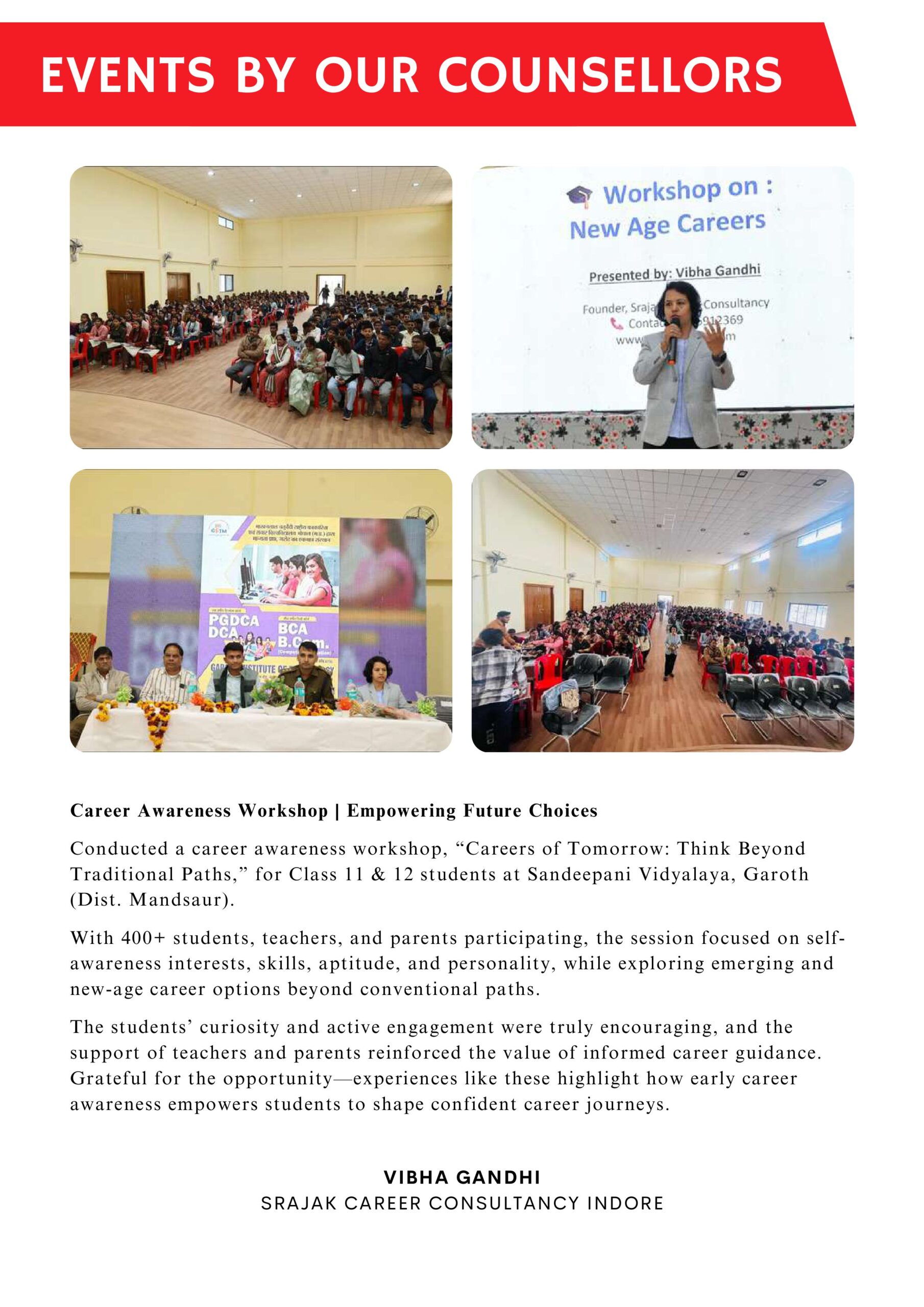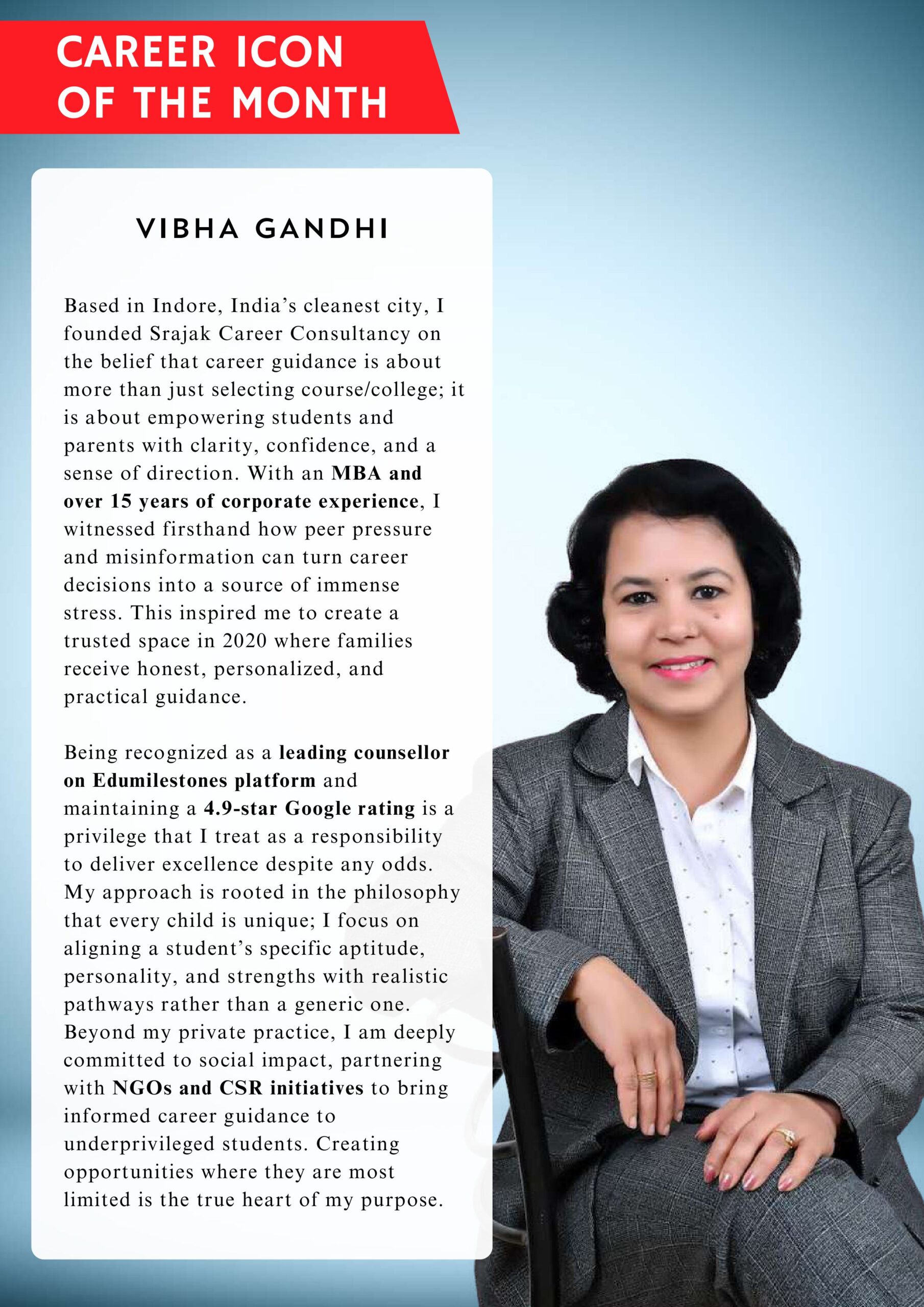 Srajak Career Consultancy, led by Ms. Vibha Gandhi, has empowered thousands with expert career guidance and proven success.