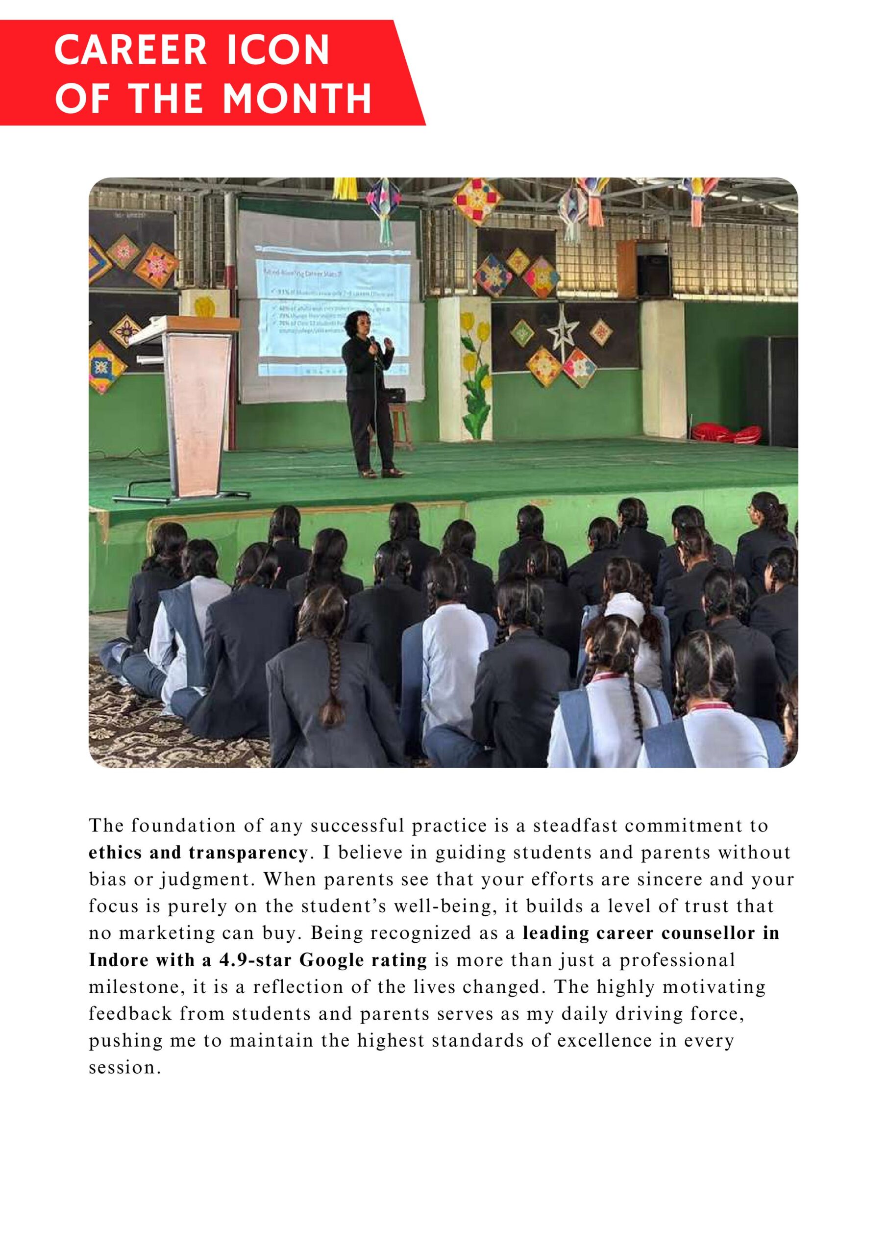 • Assistance with course selection, entrance exams, higher education (India & abroad), resume building, job search strategies, and interview preparation.